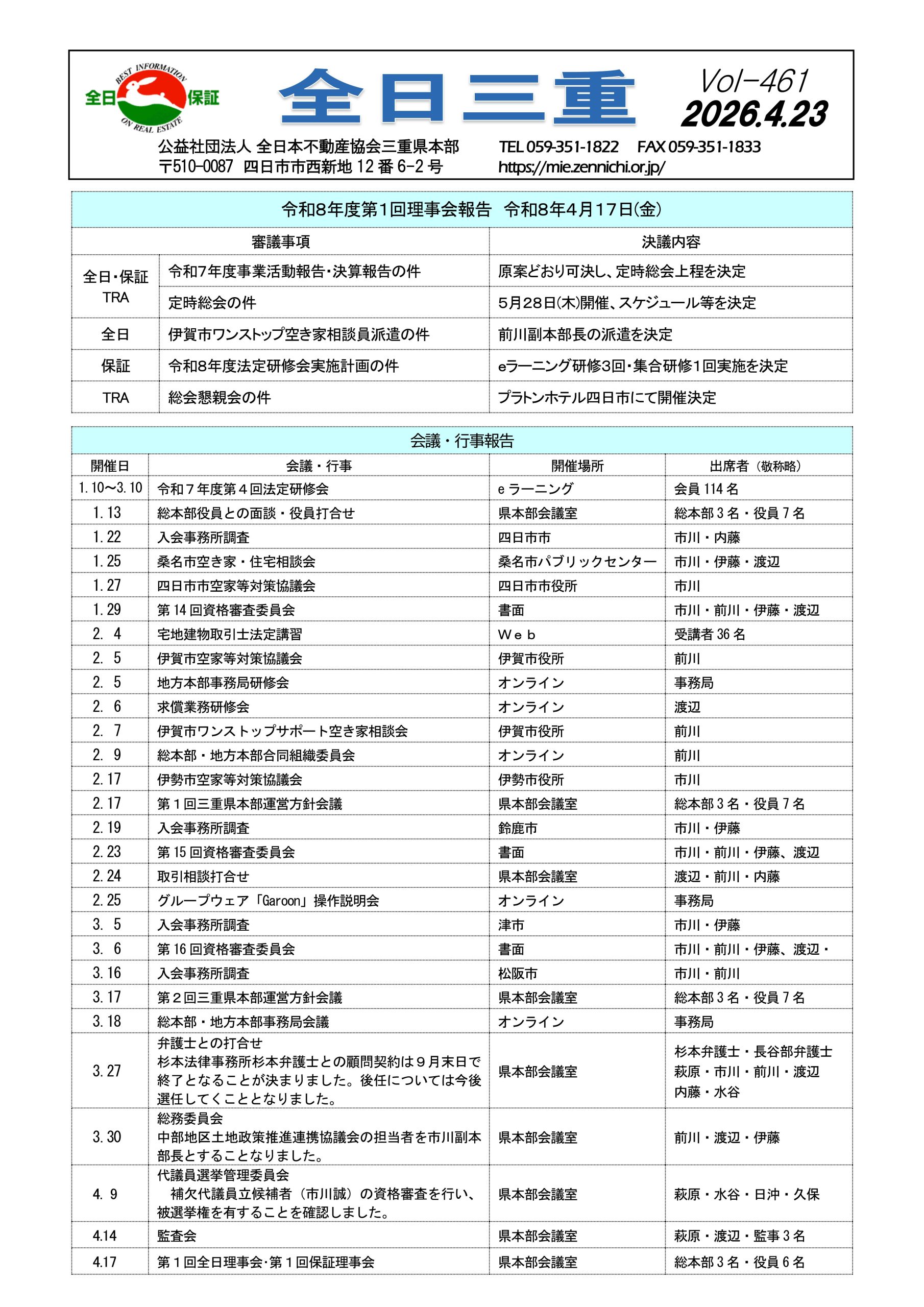 三重県本部会報誌 三重県本部では、会員の皆様に会報誌として“全日三重”を発行しています。 会報誌「全日三重」には、行政庁からの通知や当県本部の活動内容等を掲載しています。 最新号 Vol-461 2026.4.23